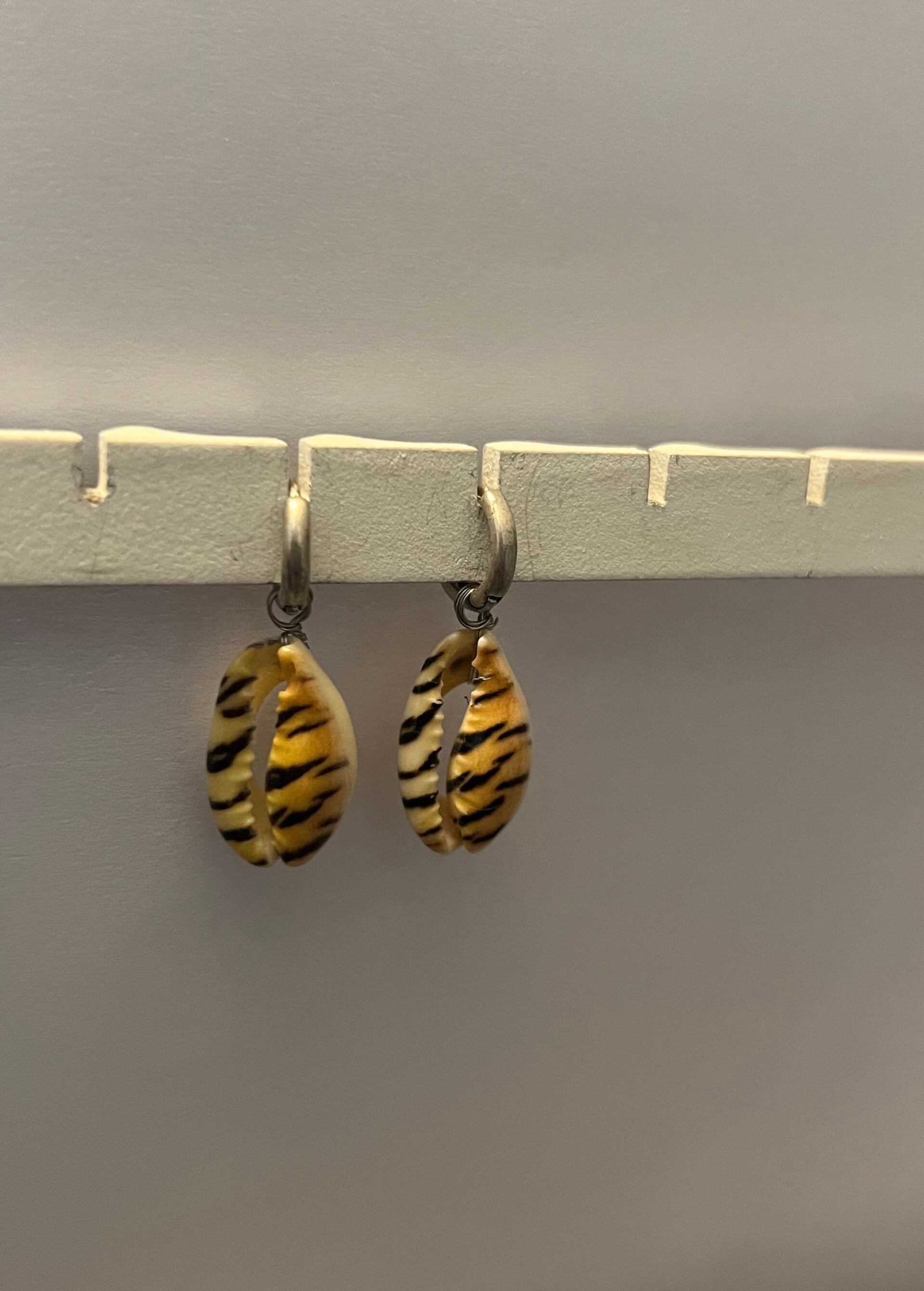 Oorbellen met bedels van schelpjes met print. Deze oorbellen zijn van RvS dus verkleuren niet